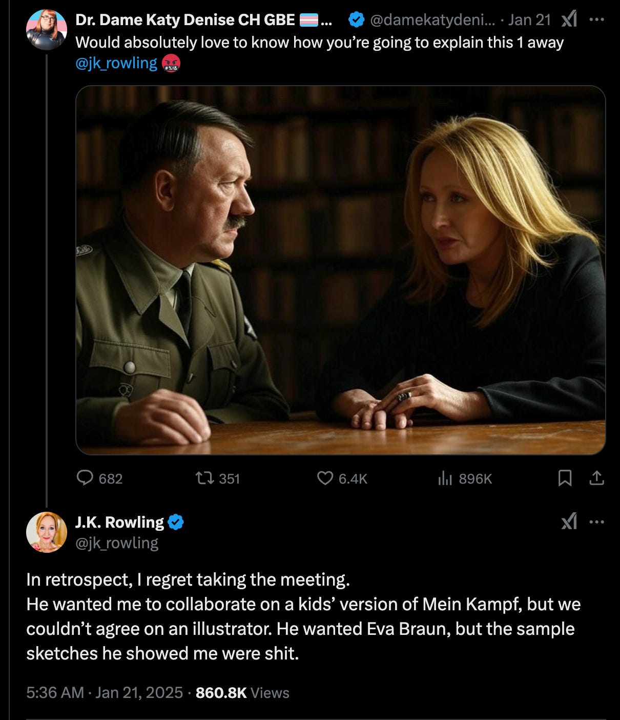 The left keeps continuing to cancel J.K. Rowling with more absurd accusations, which led to a transgender activist posting an AI meme of her with Adolf Hitler. The Harry Potter author responded hilariously, going viral yesterday in another win against leftist outrage mobs.
