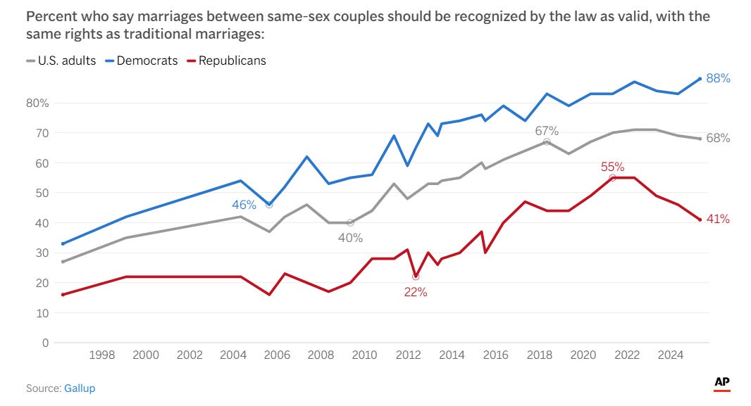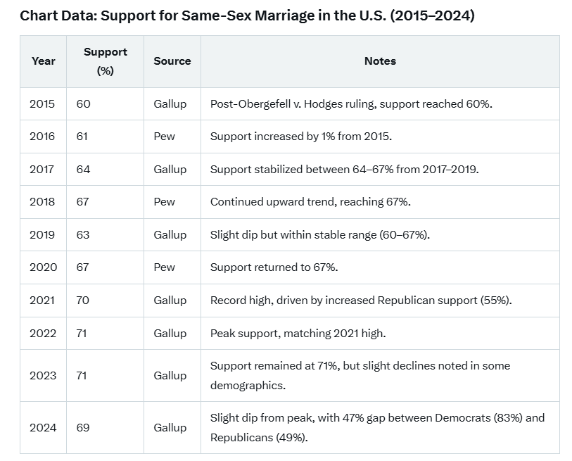 As seen in the chart below, following the Obergefell v Hodges Supreme Court ruling that legalized Sodomitic unions, public support was at 60%. Support hit a peak of 71% in 2022 and 2023. It only slightly declined to 69% in 2024. The most recent Gallup poll conducted this year shows it’s still at 68%.