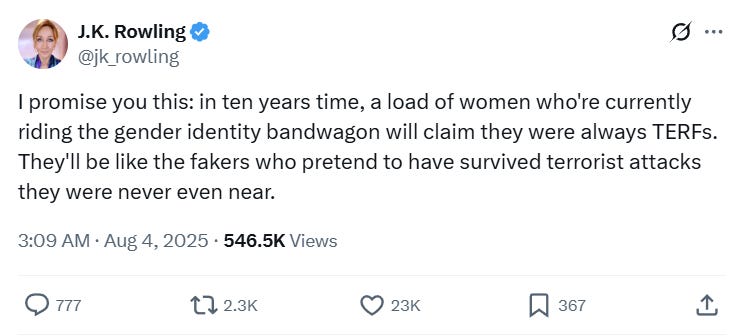 In a post to X, Rowling wrote, “I promise you this: in ten years time, a load of women who're currently riding the gender identity bandwagon will claim they were always TERFs. They'll be like the fakers who pretend to have survived terrorist attacks they were never even near.”
