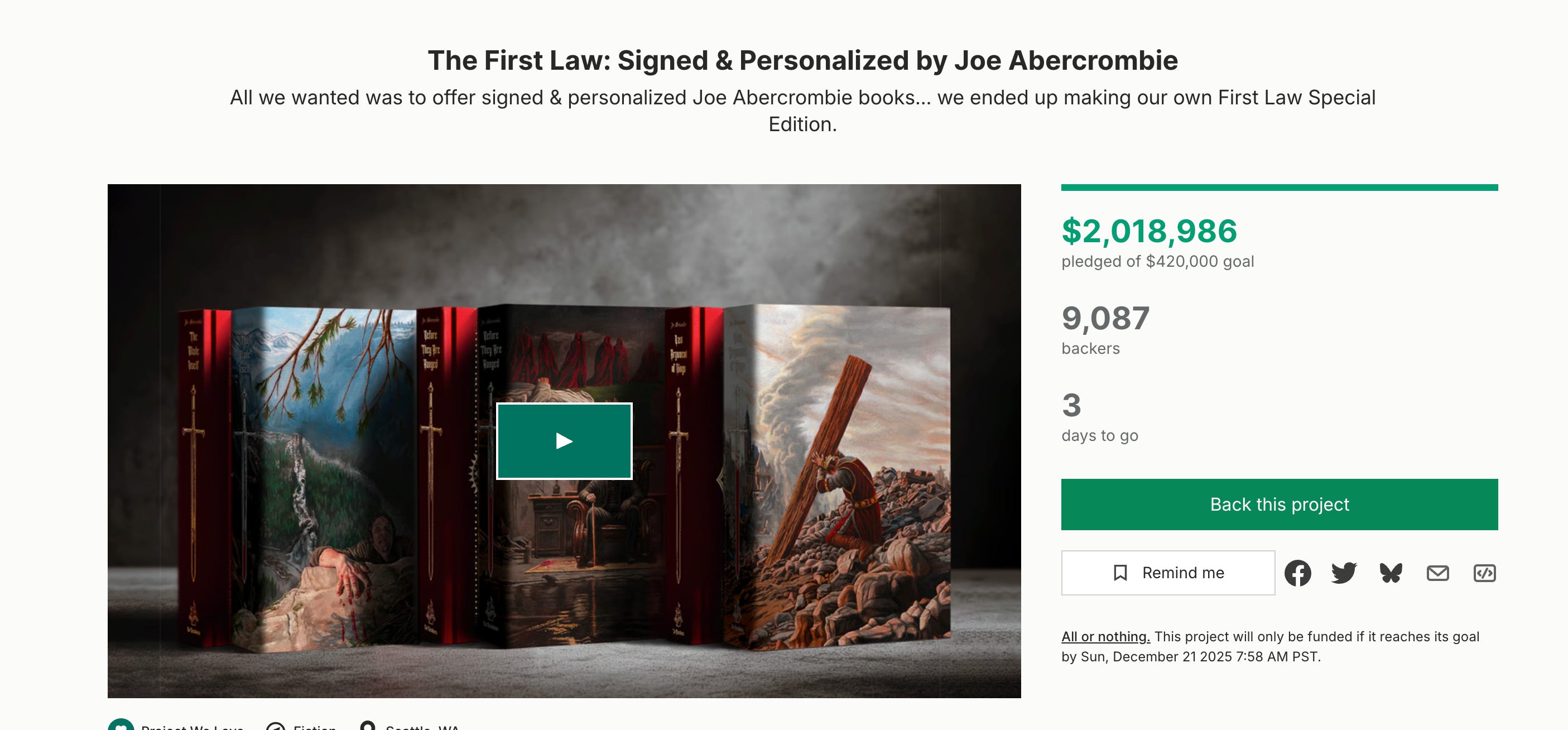 While much of crowdfunding has collapsed due to the economy in 2025, there is one star in books rising above the tends as Joe Abercrombie has crossed $2 million on his Kickstarter for The First Law with three days left to go.