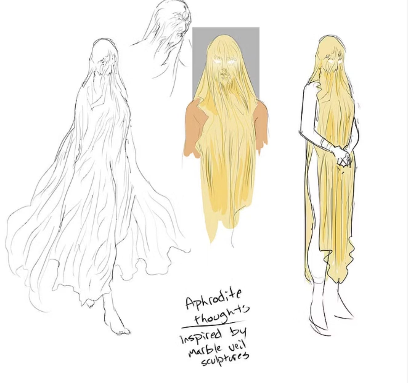 Thompson gushed over the Aphrodite design: “I just... could not love this one more. It’s probably neck and neck with Hecate for my favorite Gods design from our run. This was, I believe, the very first sketches Hayden sent in for the concept of the character and the email thread just exploded with everyone going ‘okay. that’s genius. that design is locked.’”