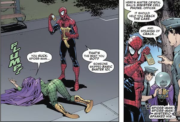 He goes even further with lame jokes as we get a Spider-Man song and a dance with dialogue: “Mysterio spanked his… Spider-Can!”