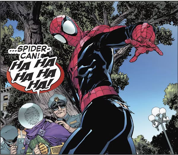 With this, Spider-Man’s suit is ripped over his butt, causing more jokes about “crack” and the like throughout the issue, which only demeans the character of Spider-Man, humiliating Peter Parker