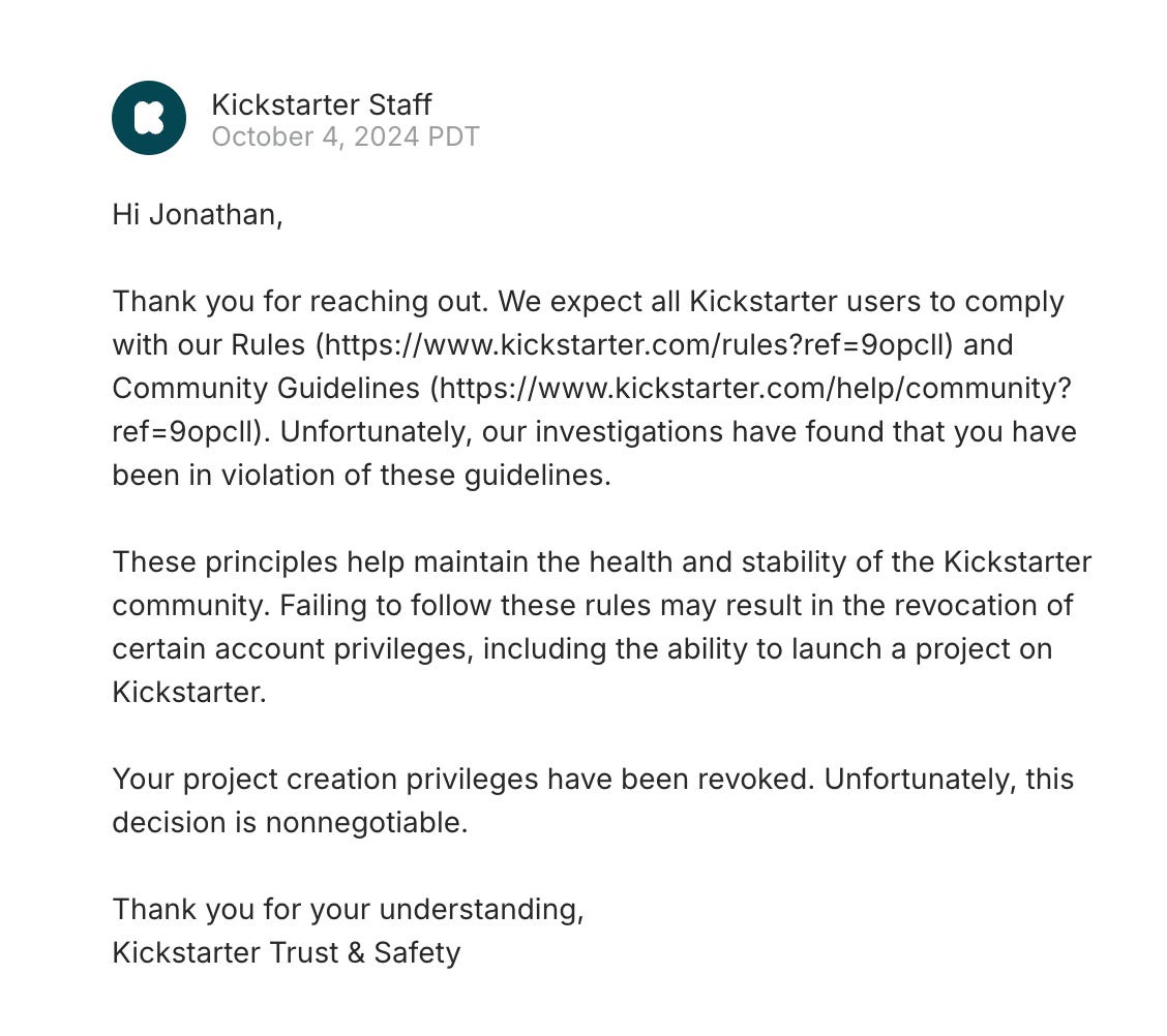 I received my answer a couple of days later: a permanent ban from creating projects, citing violations of community guidelines without specifying what they were. It was clear that the mass reporting going on during my last campaign got my account flagged even though I’d done nothing wrong.
