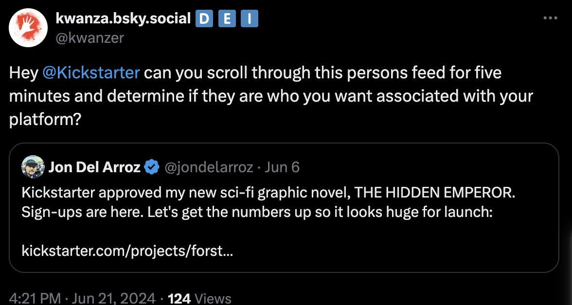 Kickstarter is literally taking food off the table for my family and for the families of my artists, who get paid very well compared to most comic outlets out there. They are literally harming multiple minorities and women, an irony as I’m sure this targeting is due to their “diversity and inclusion” agenda.