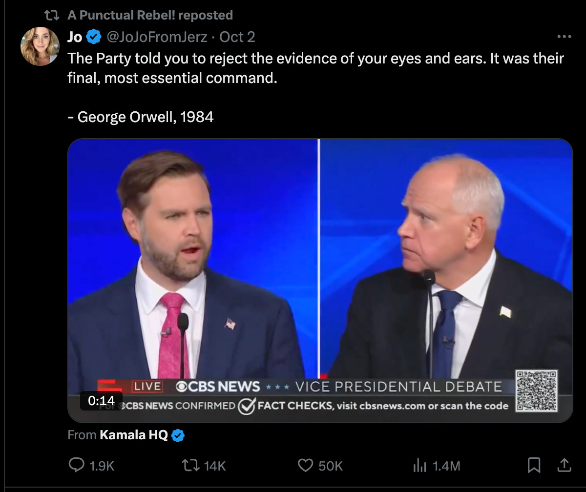 Recently, he posted comparing J.D. Vance to something from George Orwell’s 1984, despite the vast majority of the country believing Vance won the debate.
