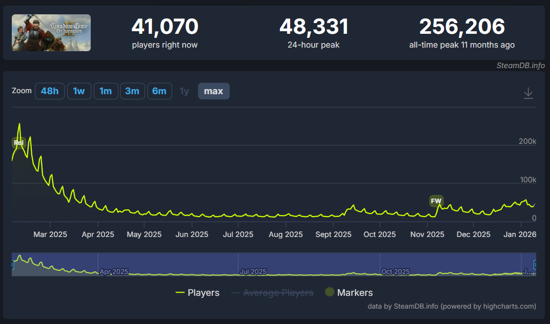 Regardless, the game still seems to be doing pretty well commercially. It had a peak player count of over a quarter million when it released and most recently still had a 24-hour peak of almost 50,000.