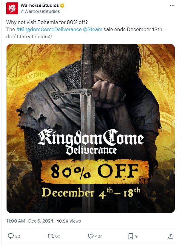 Of note, Kingdom Come: Deliverance is on sale for 80% off from December 4th to 18th.