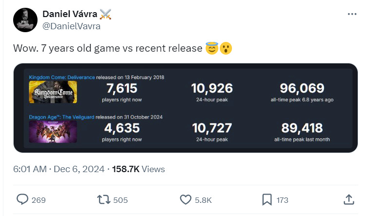 Vávra posted on X a comparison of the Steam metrics between Kingdom Come: Deliverance and Dragon Age: The Veilguard. The metrics show that Kingdom Come: Deliverance hit an all-time peak of 96,069 concurrent players compared to Veilguard’s 89,418 concurrent players.