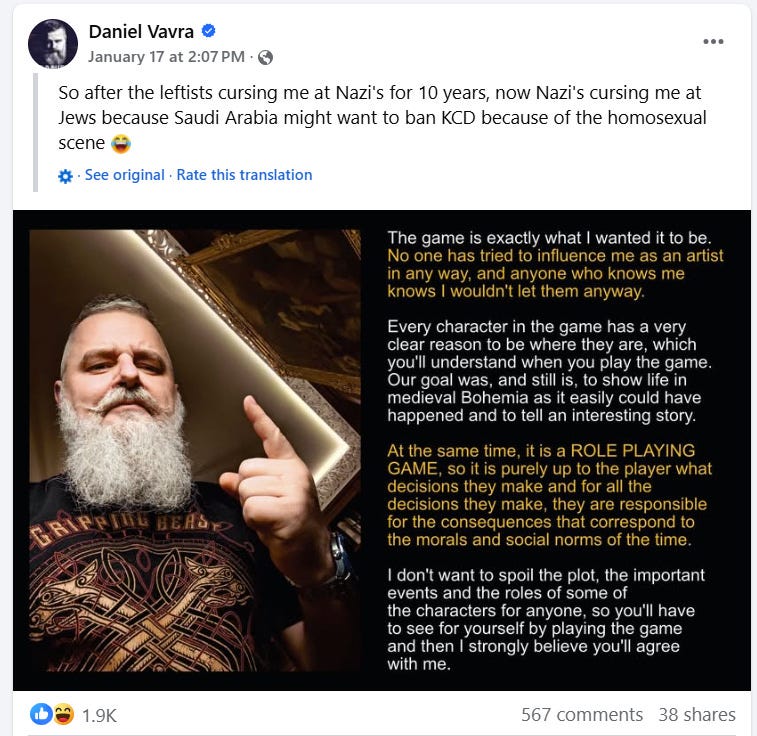 Vavra confirmed the game features sodomy earlier this month. He wrote on Facebook, “So after the leftists cursing me at Nazi's for 10 years, now Nazi's cursing me at Jews because Saudi Arabia might want to ban KCD because of the homosexual scene.”