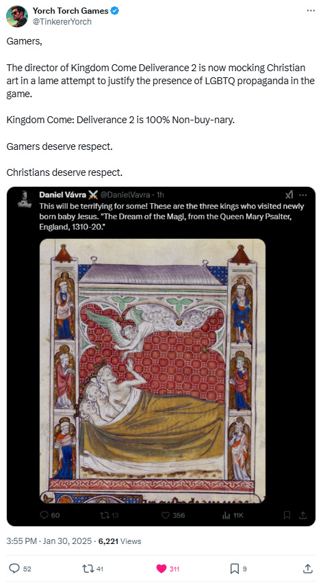 X user Yorch Torch Games reacted, “Gamers, The director of Kingdom Come Deliverance 2 is now mocking Christian art in a lame attempt to justify the presence of LGBTQ propaganda in the game. Kingdom Come: Deliverance 2 is 100% Non-buy-nary. Gamers deserve respect. Christians deserve respect.”