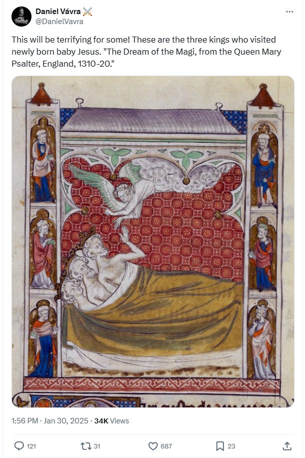 On X he wrote, “This will be terrifying for some! These are the three kings who visited newly born baby Jesus. "The Dream of the Magi, from the Queen Mary Psalter, England, 1310-20."
