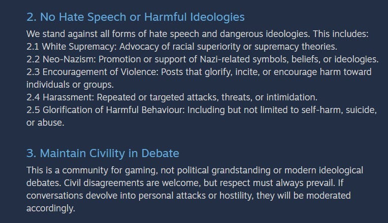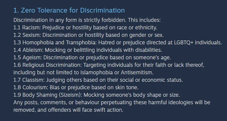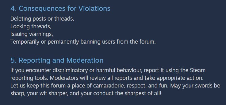 He wrote, “If you encounter discriminatory or harmful behaviour, report it using the Steam reporting tools. Moderators will review all reports and take appropriate action.