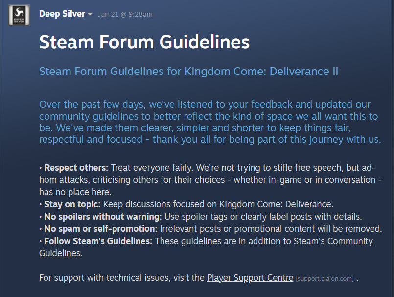 In a post pinned to the game’s Steam forum, the company stated, “Over the past few days, we've listened to your feedback and updated our community guidelines to better reflect the kind of space we all want this to be. We've made them clearer, simpler and shorter to keep things fair, respectful and focused - thank you all for being part of this journey with us.”