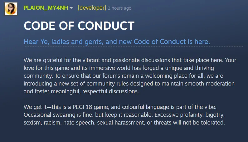 About a week ago, moderator My4NH from Plaion shared a Code of Conduct for the forum stating, “We are grateful for the vibrant and passionate discussions that take place here. Your love for this game and its immersive world has forged a unique and thriving community. To ensure that our forums remain a welcoming place for all, we are introducing a new set of community rules designed to maintain smooth moderation and foster meaningful, respectful discussions.”