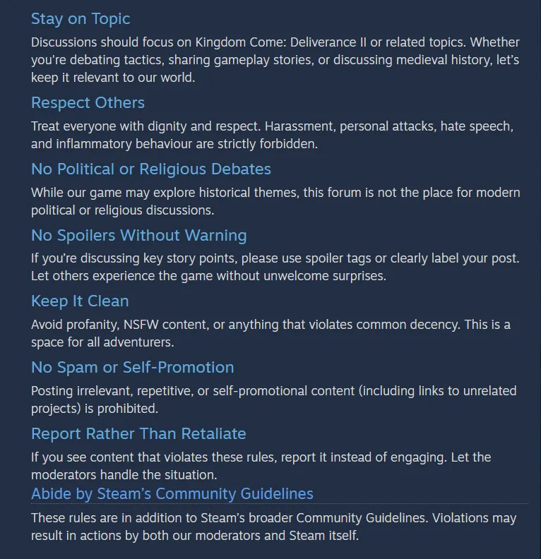 • Stay on topic: Keep discussions focused on Kingdom Come: Deliverance.