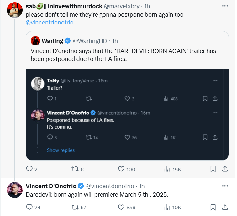 Vincent D’Onofrio appeared to claim that a trailer for the upcoming Daredevil: Born Again Disney+ series has been delayed due to the LA fires.