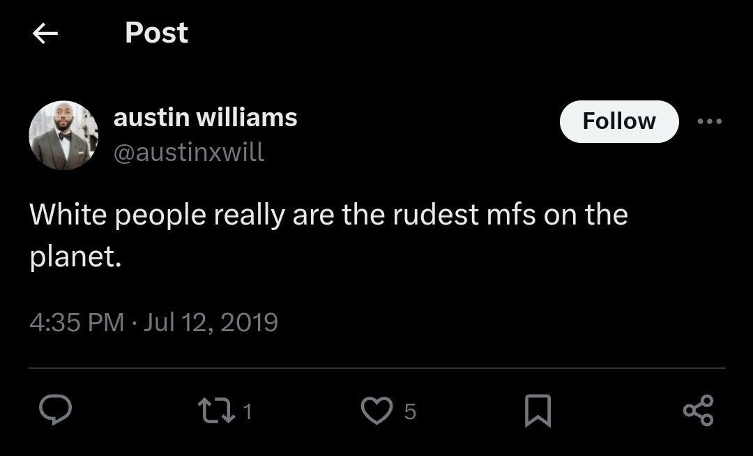 To cap it all off, and just make it clear that he hates white people, Williams posted on X in 2019: “White people really are the rudest mfs on the planet.”