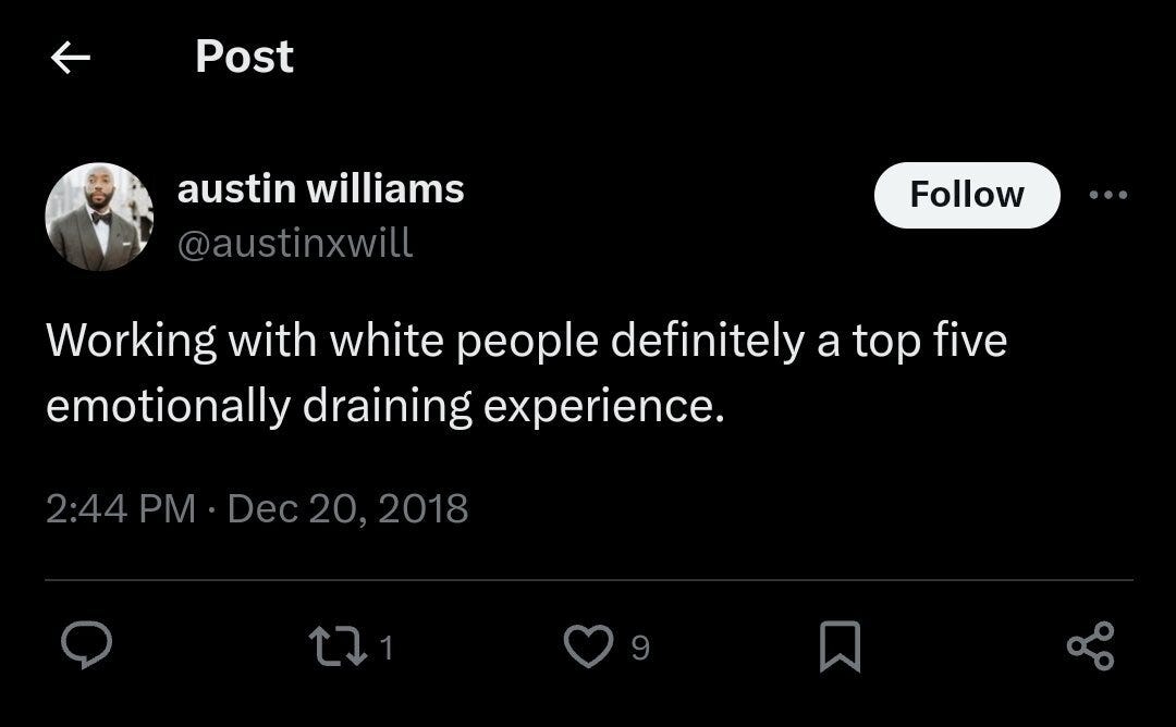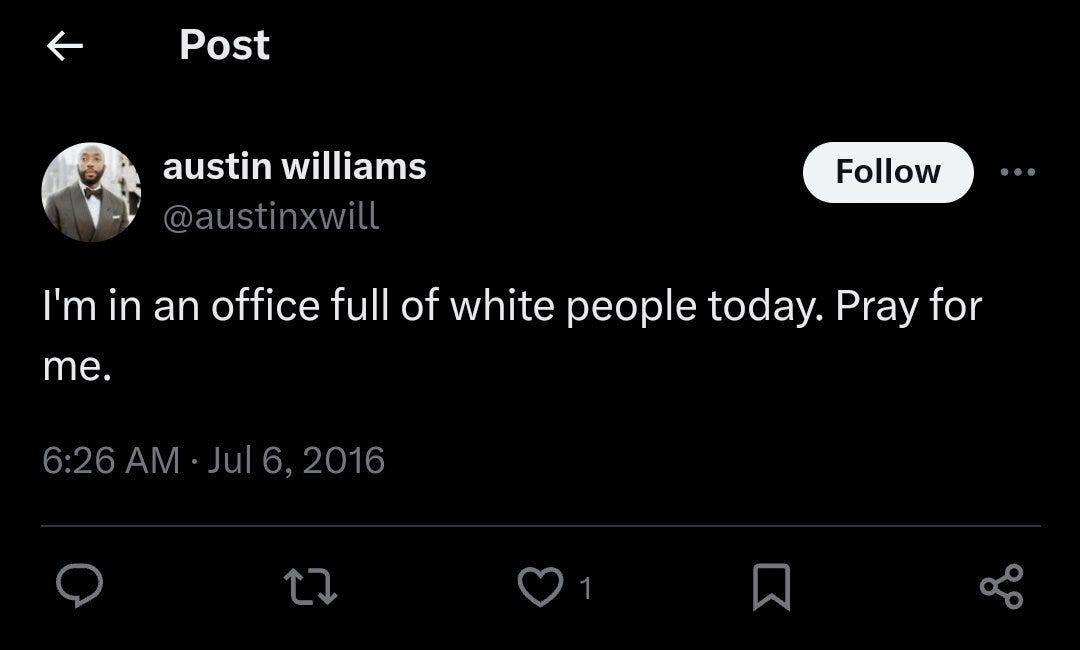 Old tweets by Williams have surfaced, where he said things about white people that would have gotten anyone fired at any job if it was a white person saying what he did about black people. In 2016 Williams posted on X (then Twitter): “I'm in an office full of white people people today. Pray for me.”