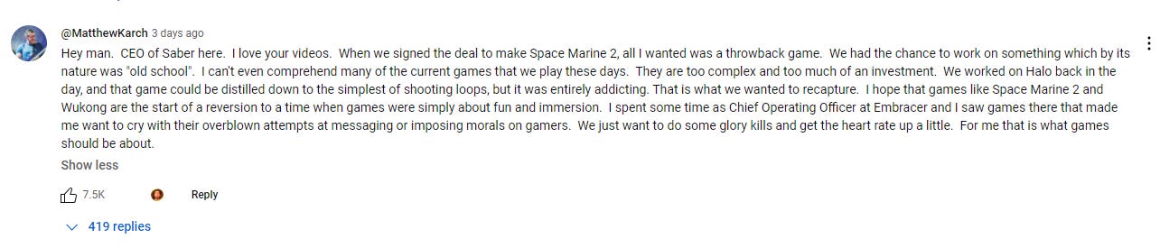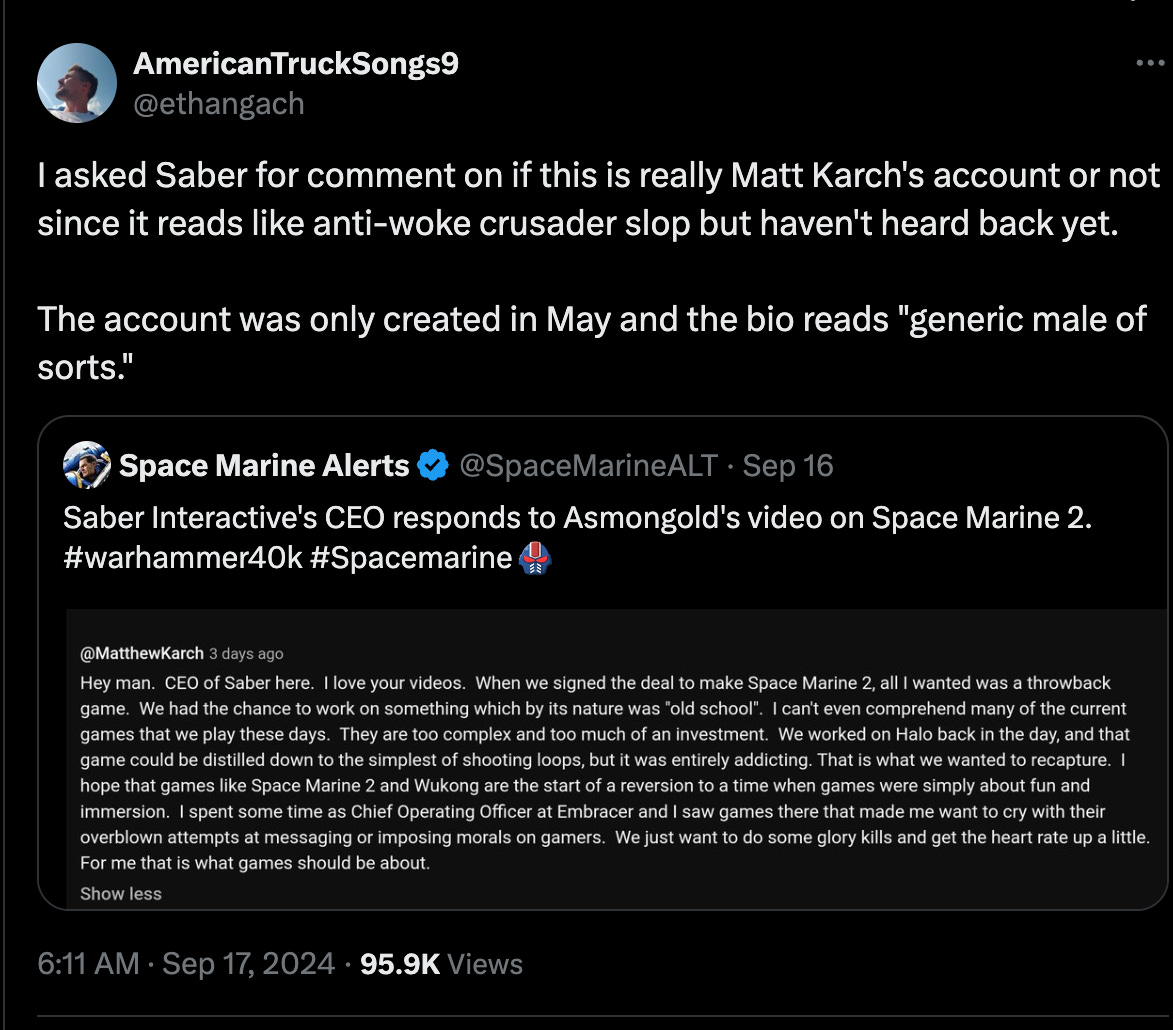 Ethan Gach, Kotaku Journo, went after the CEO after a comment by the CEO saying, “Hey man. CEO of Saber here. I love your videos. When we signed the deal to make Space Marine 2, all I wanted was a throwback game. We had the change to work on something which by its nature was ‘old school’. I can’t even comprehend many of the current games that we play these days. They are too complex and too much of an investment. We worked on Halo back in the day, and that game could be distilled down to the simplest of shooting loops, but it was entirely addicting. That is what we wanted to recapture. I hope that games like Space Marine 2 and Wukong are the start of a reversion to a time when games were simply about fun and immersion. I spent some time as Chief Operating Officer at Embracer and I saw games there that made me want to cry with their overblown attempts at messaging or imposing morals on gamers. We just want to do some glory kills and get the heart rate up a little. For me that is what games should be about.”