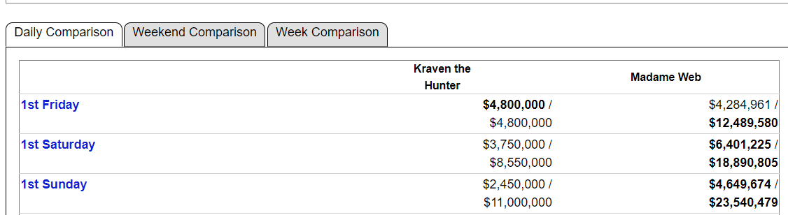 In comparison, Madame Web had an opening weekend of $15.3 million albeit it brought in over $6 million on its release day Wednesday February 14th and another $2.1 million on Thursday, which are not included in its opening weekend totals. By the end of its first weekend, Madame Web had grossed $23.5 million.