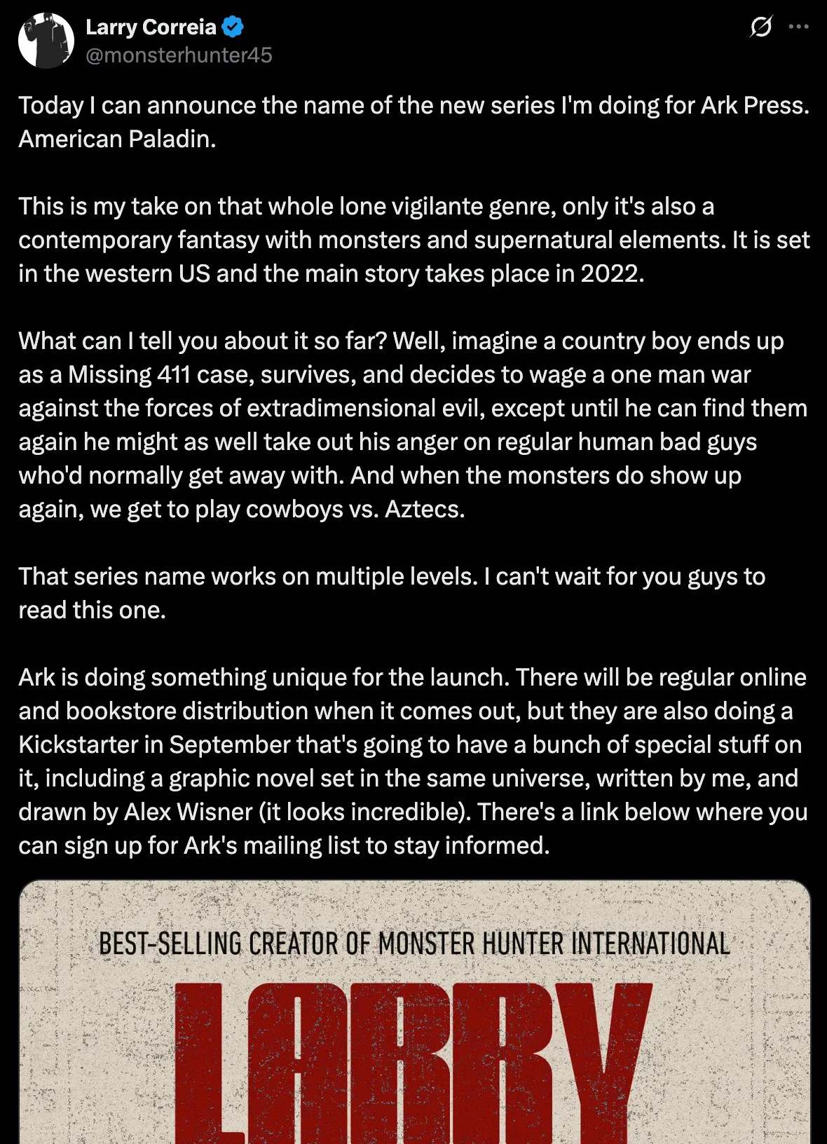 Larry Correia Announces Graphic Novel Art and Audiobook Narrator For His Ark Press American Paladin Release