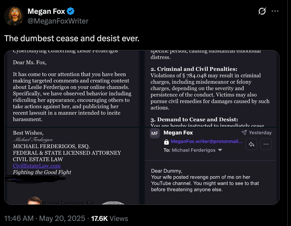 Megan Fox, who has since changed her profile picture on X to a muppet version of herself, posted a cease and desist letter saying “It has come to our attention you have been making targeted comments and creating content about Leslie Ferderigos on your online channels. Specifically, we have observed behavior including ridiculing her appearance, encouraging others to take action against her, and publicizing her recent lawsuit in a manner intending to incite harassment.”