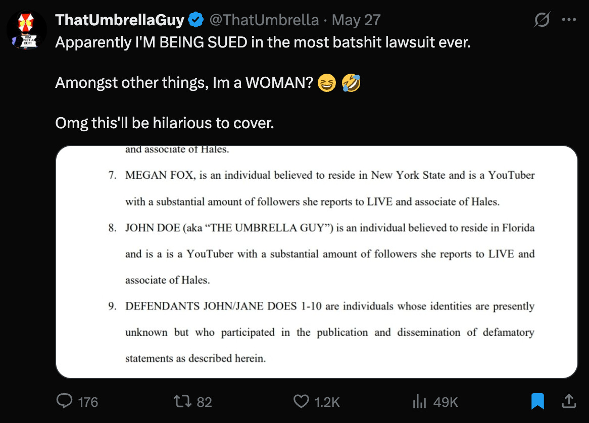 ThatUmbrellaGuy and Megan Fox revealed that because of their YouTube coverage of the Jeremy Hales trial, an unhinged woman filed a lawsuit against them for saying she looked like a muppet on a playful live stream.