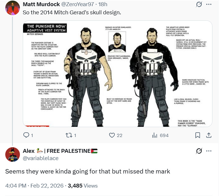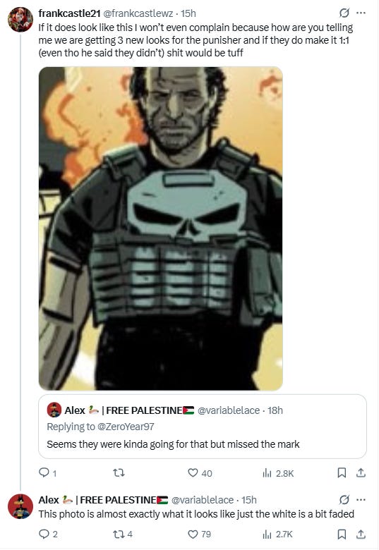 The alleged leaker, Variablelace posted to X, “I’m ngl, I think people are gonna be disappointed when they see what punisher is wearing in BND.”