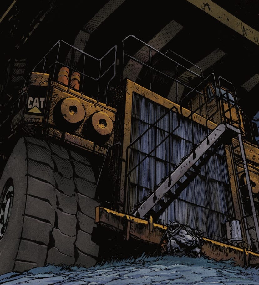 While undergoing this reflection, Batman looks at his bloodstained hands and then curls up in a ball and begins to cry at the bottom of the giant dump truck.