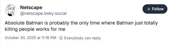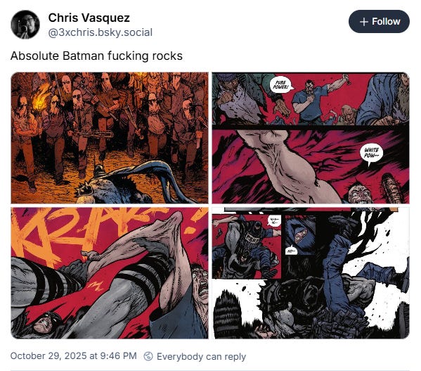 On BlueSky , Chris Vasquez wrote, “Absolute Batman (expletive) rocks.”