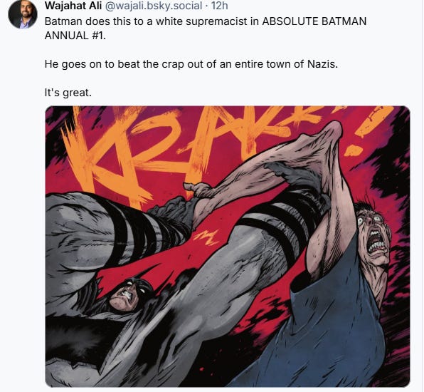 Wajahat Ali wrote, “Batman does this to a white supremacist in ABSOLUTE BATMAN ANNUAL #1. He goes on to beat the crap out of an entire town of Nazis. It’s great.”