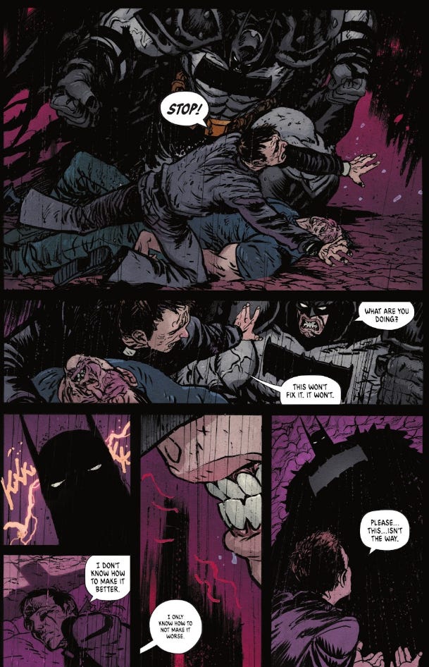 In fact at one point in the story, the priest stops Batman from further brutalizing one of the white supremacists. When Batman questions why, Father Peters tells him, “This won’t fix it. It won’t.”