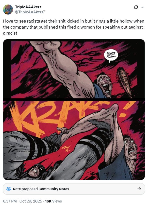 One leftist wrote, “I love to see racists get their (expletive) kicked in but it rings a little hollow when the company that published this fired a woman for speaking out against a racist.”