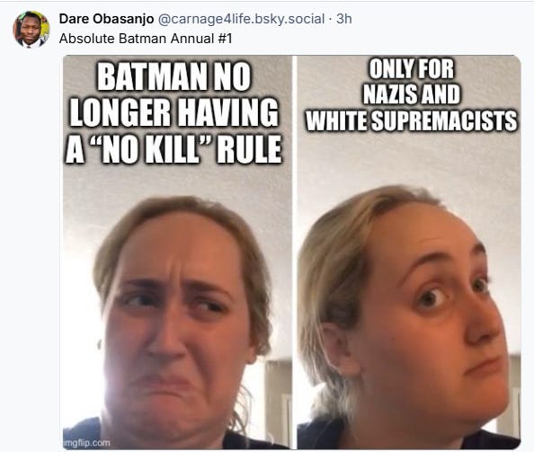 Another wrote, “Absolute Batman is probably the only time where Batman just totally killing people works for me.”