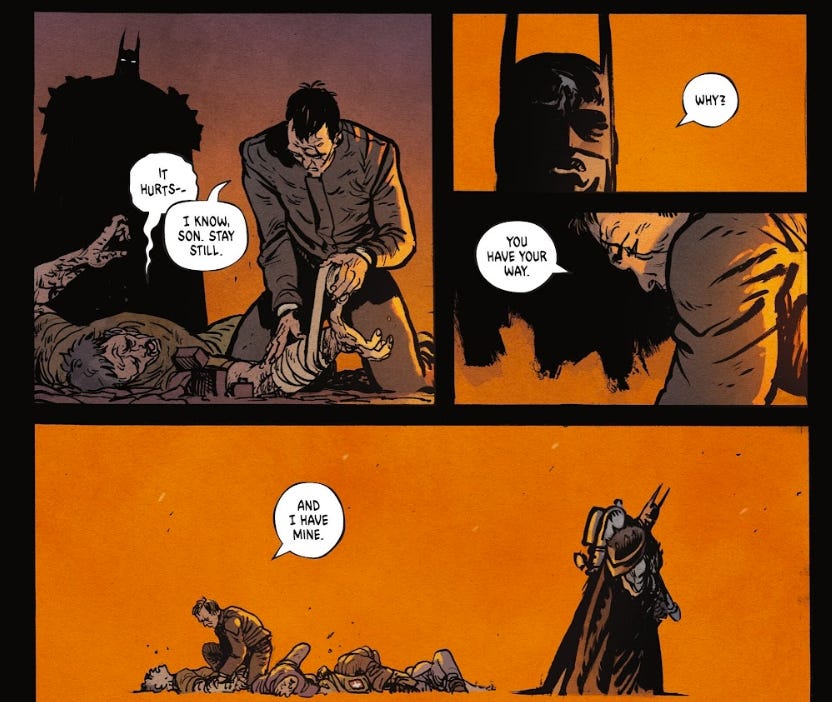 Then as shown above he stops Batman from further brutalizing the white supremacists and offers them aid after Batman’s attack.