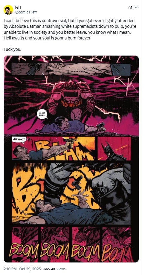 Another posted, “I can’t believe this is controversial, but if you got even slightly offended by Absolute Batman smashing white supremacists down to pulp, you’re unable to live in society and you better leave. You know what I mean. Hell awaits and your soul is gonna burn forever. (Expletive) you.”