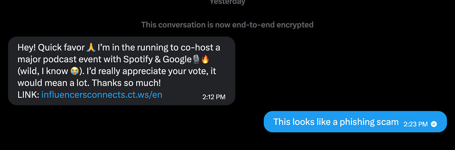 Since Tucci is active in the podcasting world, doing livestreams for his books and the comic industry, it seems like a reasonable ask, though Tucci is not known to speak in emojis as a rule. The link goes to a site that is clearly a phishing scam, prompting people to put in their passwords for various socials to vote.