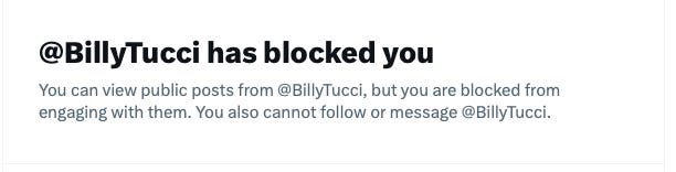 Soon after Tucci began complaining about it on X, the main account then blocked his new one to try to dampen his reach: