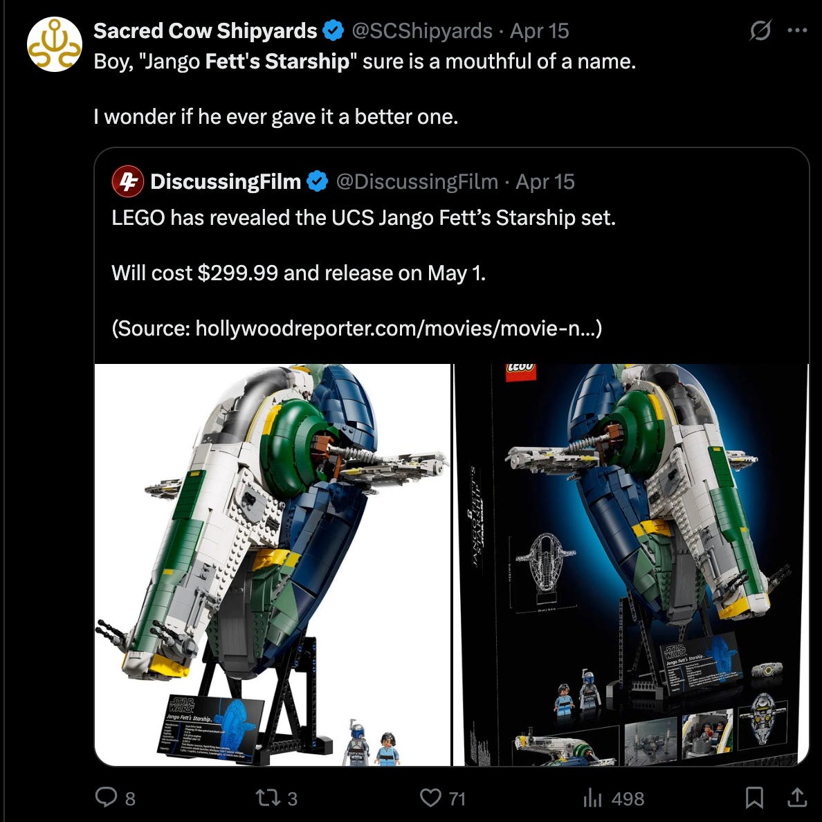 Another quote tweeted, “Boy, "Jango Fett's Starship" sure is a mouthful of a name. I wonder if he ever gave it a better one.”