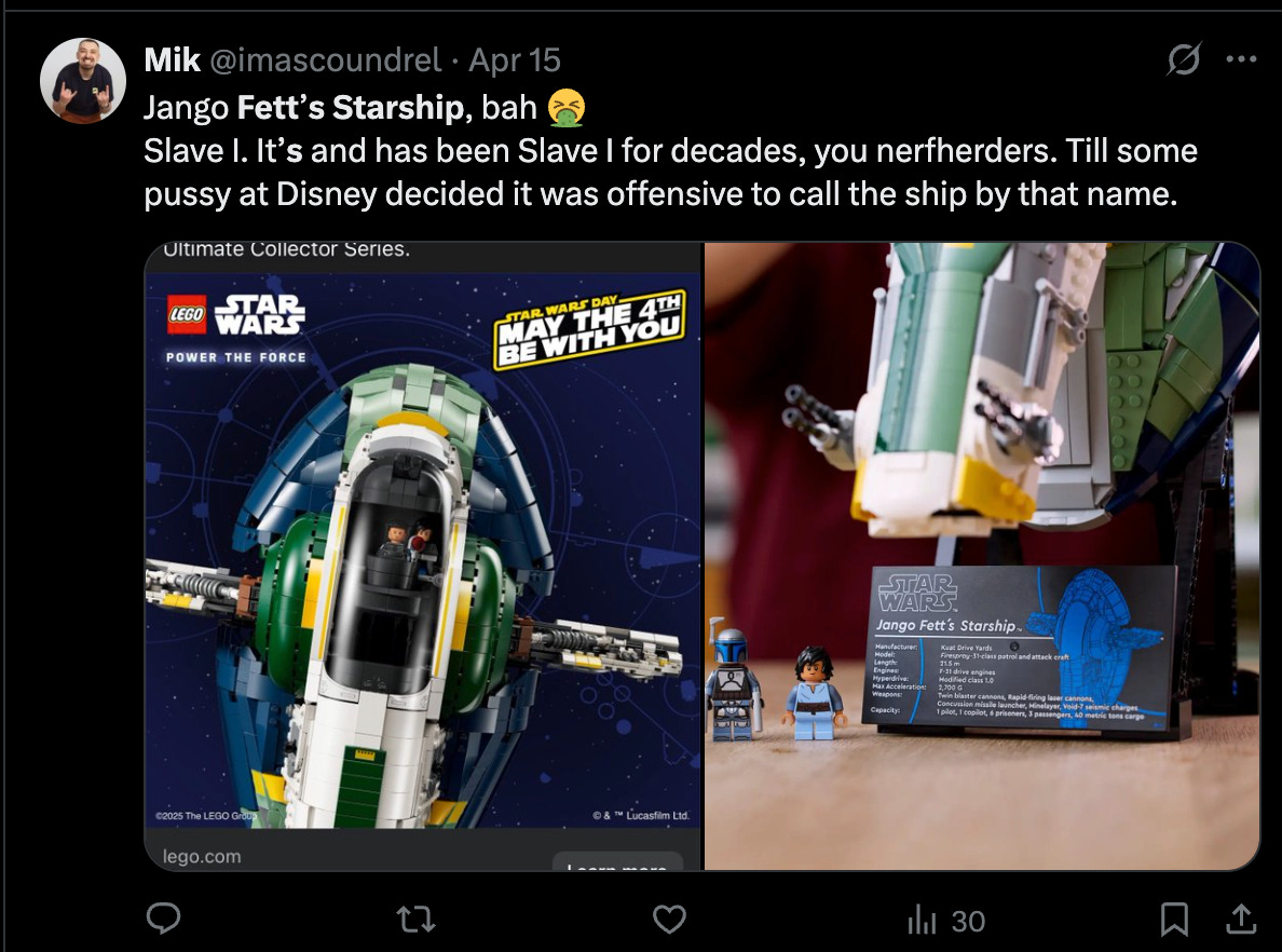 A third said, “Jango Fett’s Starship, bah Slave I. It’s and has been Slave I for decades, you nerfherders. Till some pussy at Disney decided it was offensive to call the ship by that name.”