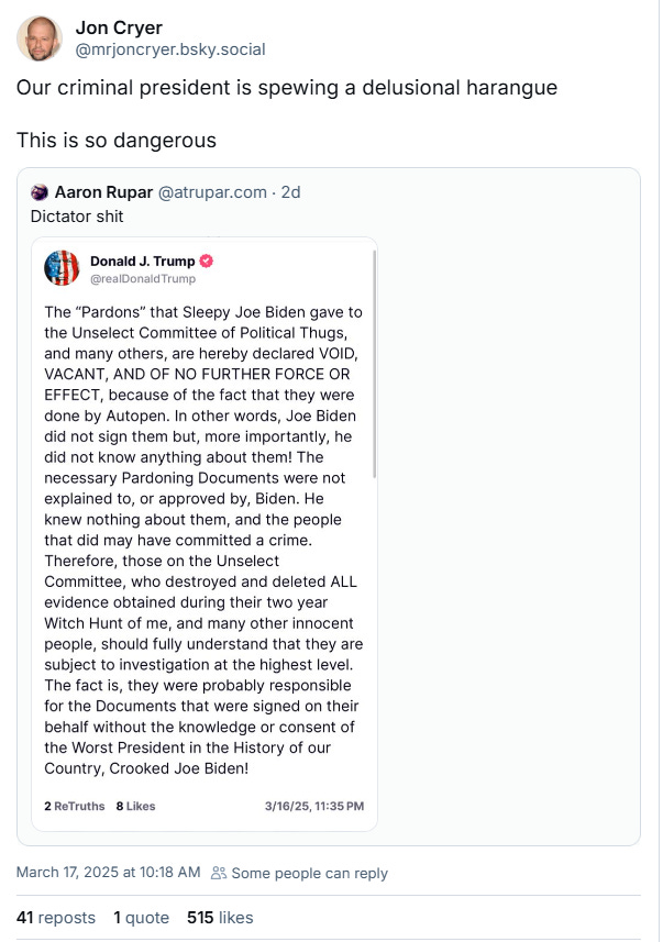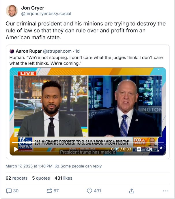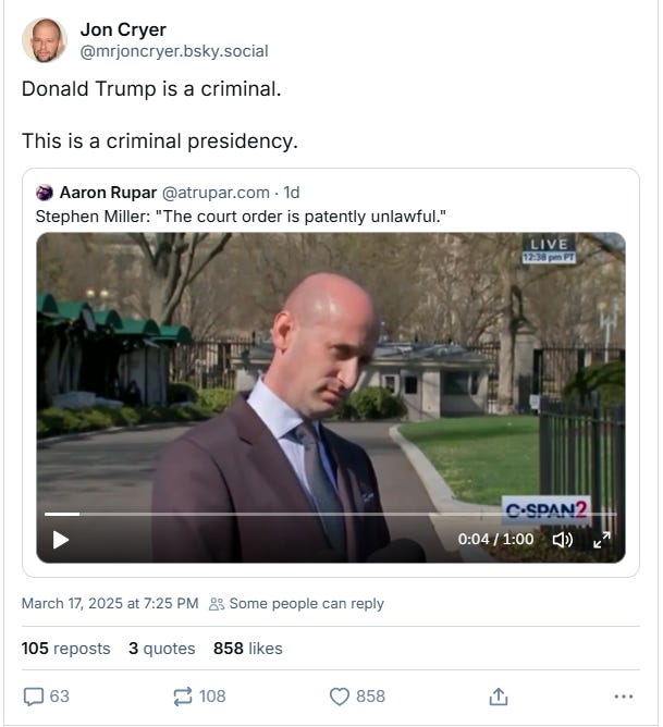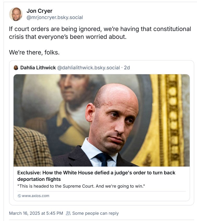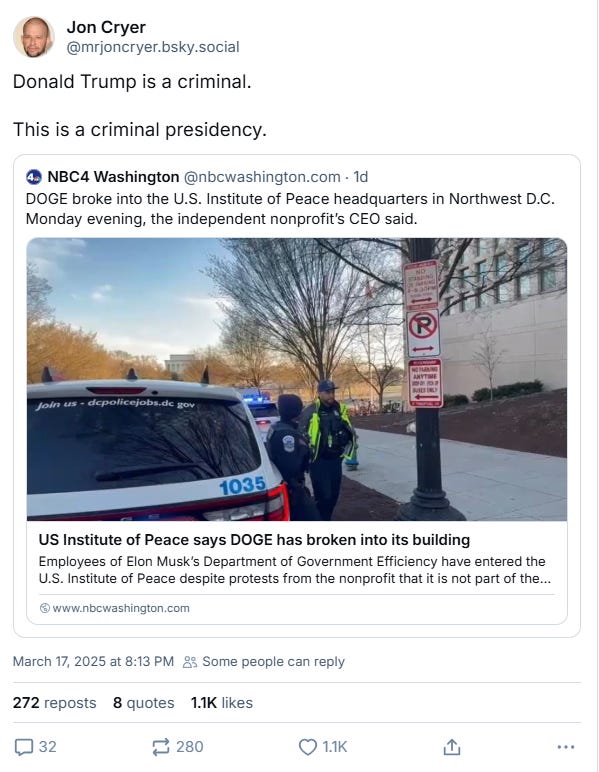 This most recent post appears to be part of a pattern of increasingly manic rhetoric from Cryer. On March 16th, he wrote, “If court orders are being ignored, we’re having that constitutional crisis that everyone’s been worried about. We’re there, folks.”