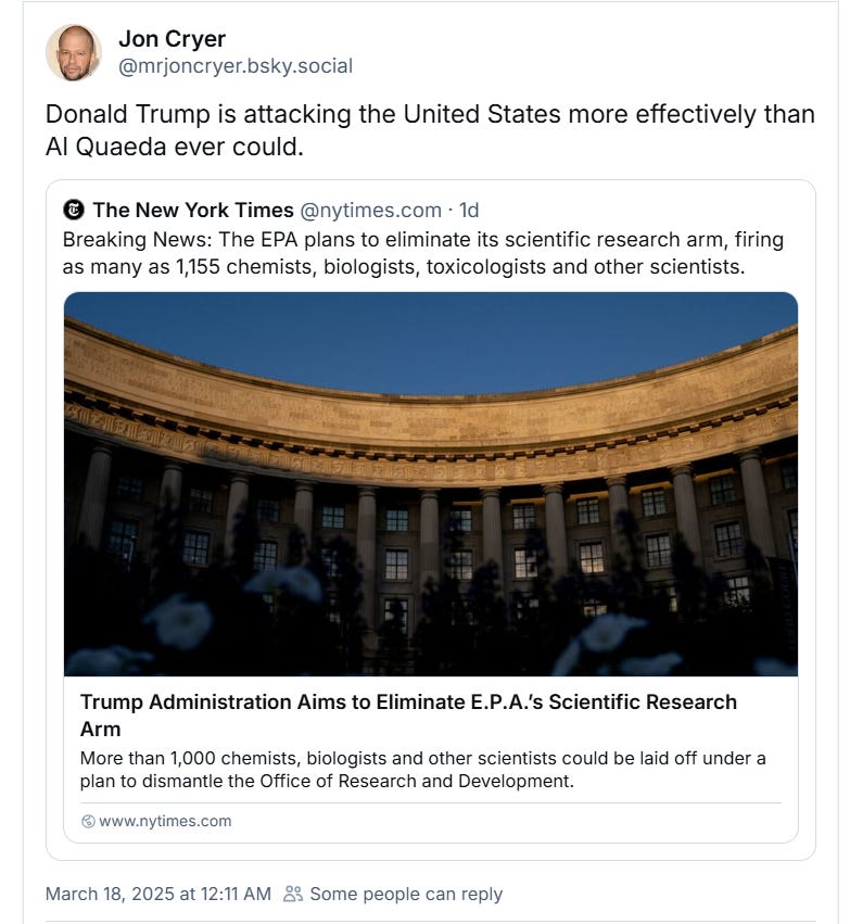 In a post to BlueSky, Cryer wrote, “Donald Trump is attacking the United States more effectively than Al Quaeda ever could.”