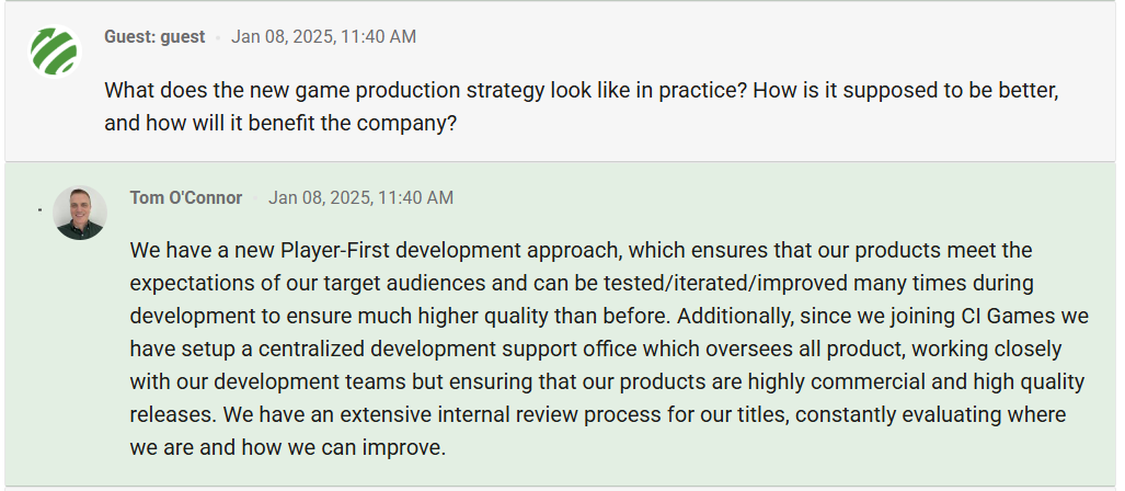 Furthermore, the company’s newly appointed Senior Vice President of Development Tom O’Connor also fielded a question about the company’s new game production strategy and what it looks like in practice.