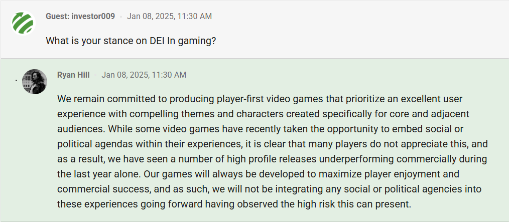 During an investor chat published by Strefa Inwestorow, the company’s Global Marketing Director Ryan Hill responded to a question asking, “What is your stance on DEI in gaming?”