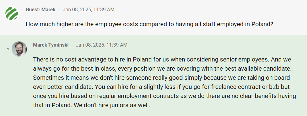 He replied, “There is no cost advantage to hire in Poland for us when considering senior employees. And we always go for the best in class, every position we are covering with the best available candidate. Sometimes it means we don't hire someone really good simply because we are taking on board even better candidate. You can hire for a slightly less if you go for freelance contract or b2b but once you hire based on regular employment contracts as we do there are no clear benefits having that in Poland. We don't hire juniors as well.”