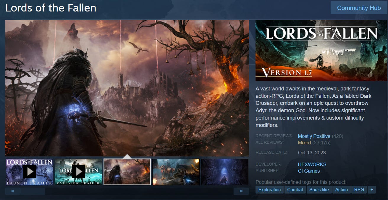 CI Games’ Lords of the Fallen released in October 2023. It currently has Mixed reviews on Steam albeit Recent Reviews are Mostly Positive.