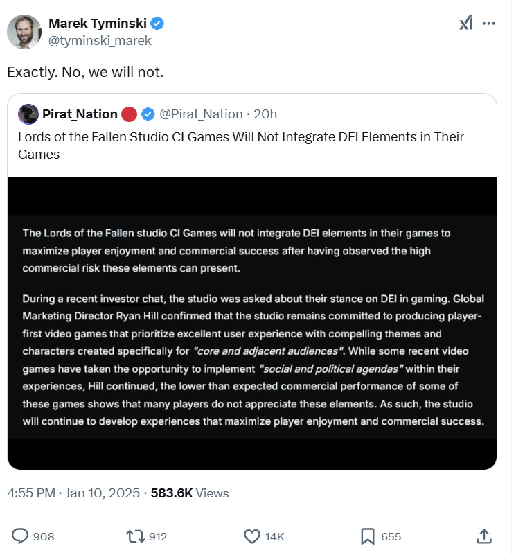 'Lords Of The Fallen' CEO Declares His Company Will Not Integrate DEI Into Its Games: "No, We Will Not"
