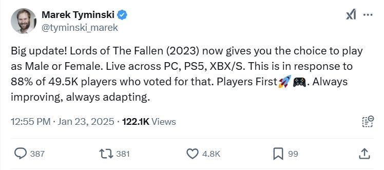 After the poll closed, Tyminski took to X and shared, “With over 49K votes, 88% of you said you prefer "male/female" choice. As a player-first studio, we will update Lords of the Fallen (2023) and future titles in the series accordingly. Stay Tuned.”