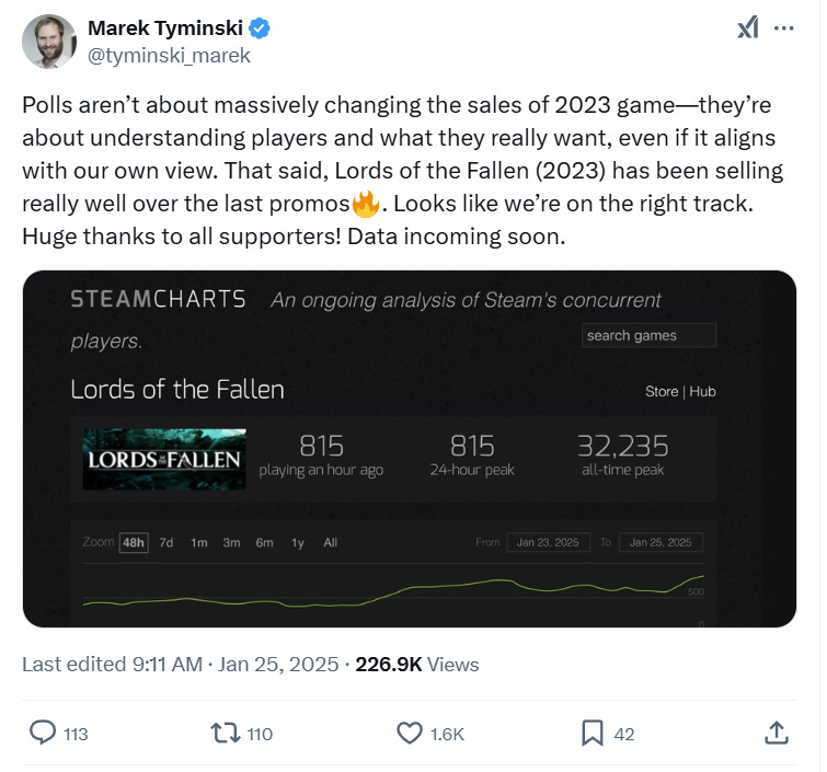He wrote on X, “Polls aren’t about massively changing the sales of 2023 game—they’re about understanding players and what they really want, even if it aligns with our own view. That said, Lords of the Fallen (2023) has been selling really well over the last promos. Looks like we’re on the right track. Huge thanks to all supporters! Data incoming soon.”